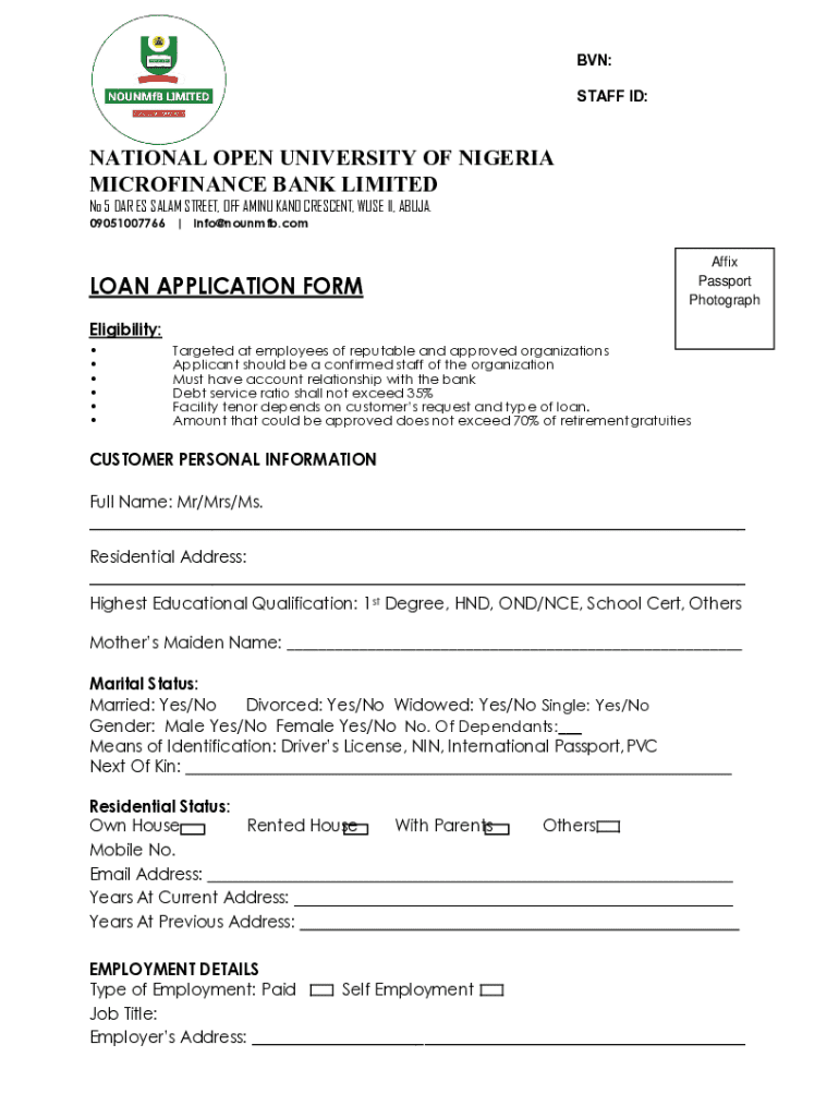 The NOUN Microfinance Bank Loan Application Form is a financial document used by employees of approved organizations to apply for loans from the National Open University of Nigeria Microfinance Bank.