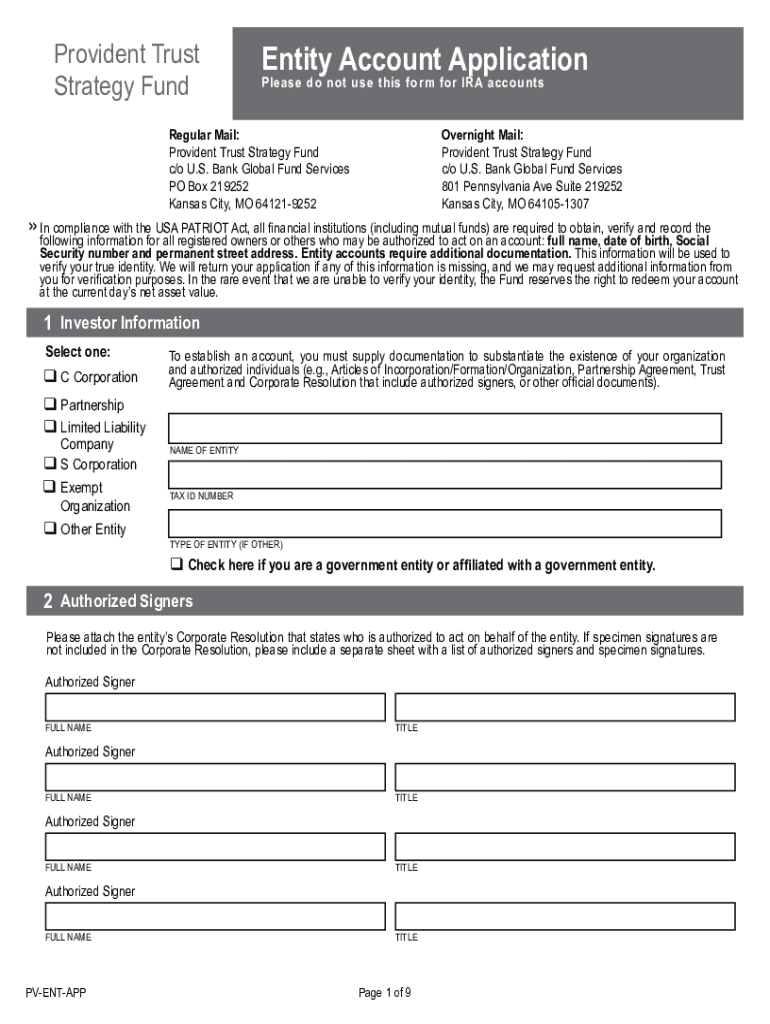 The Provident Trust Entity Account Application is essential for establishing an account with the Provident Trust Strategy Fund. This application form is designed to collect vital information necessary for compliance and account setup. Key fields in the application include the entity's tax ID number, authorized signers, and details about beneficial owners.
