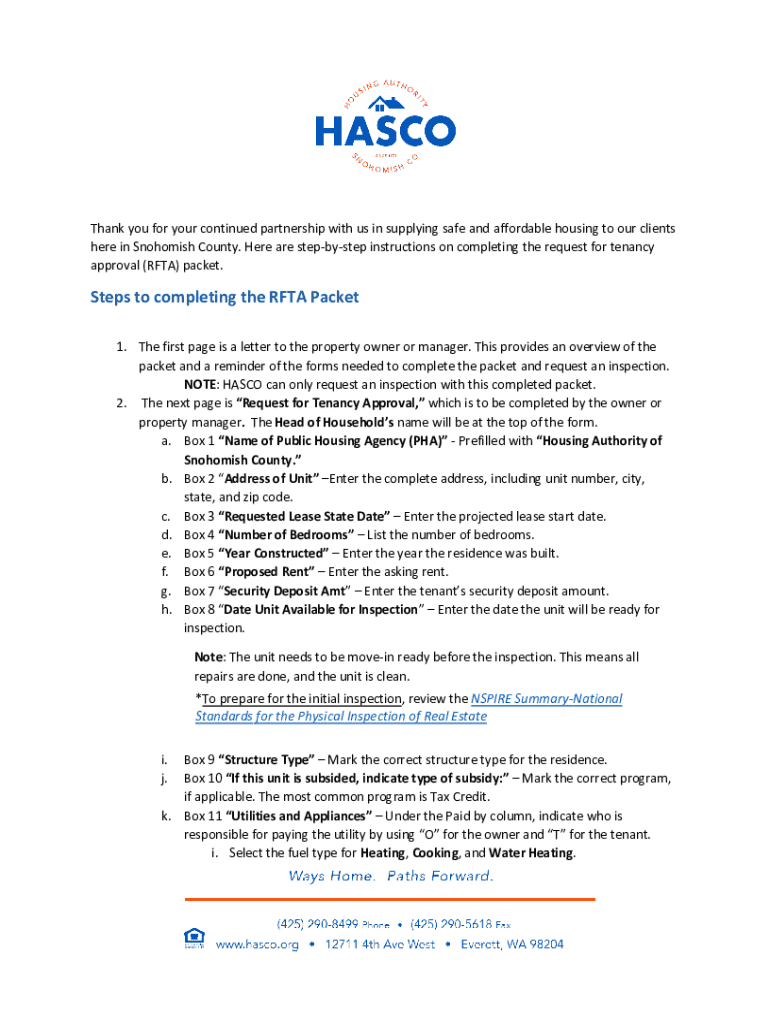 The Request for Tenancy Approval Packet is a real estate form used by property owners/managers and tenants in Washington to request an inspection for tenancy approval.