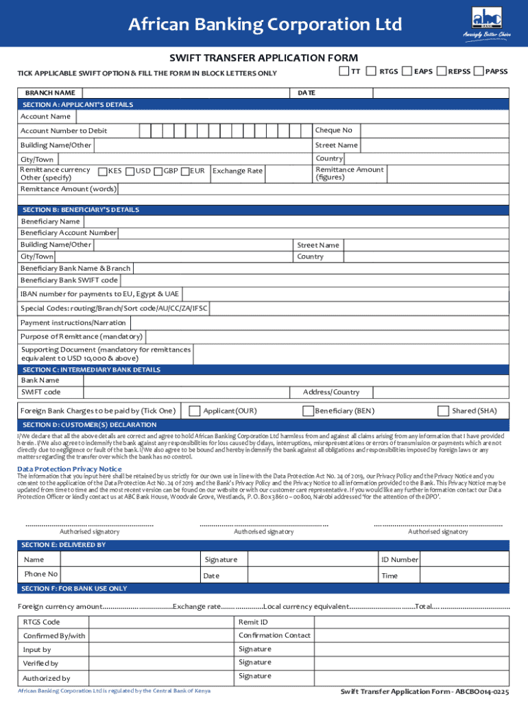 To use the African Banking Corporation Swift Transfer Application Form, you must be an authorized signatory for the account from which funds will be transferred and have the necessary recipient and bank information.