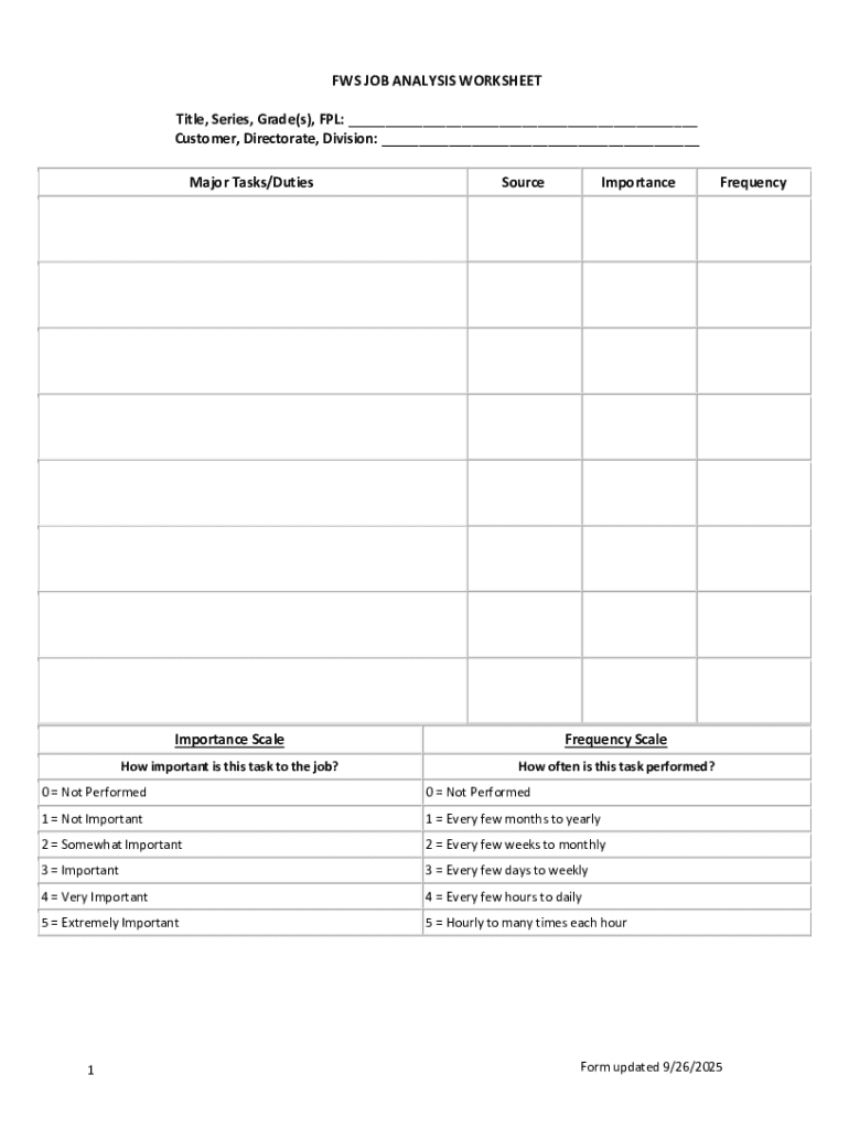 The FWS Job Analysis Worksheet serves as an essential tool within the Federal Wildlife Service for job evaluation. This document plays a critical role in documenting various tasks, duties, and competencies related to specific positions. Regular updates to this worksheet are vital to ensure that it accurately reflects current job requirements and responsibilities.