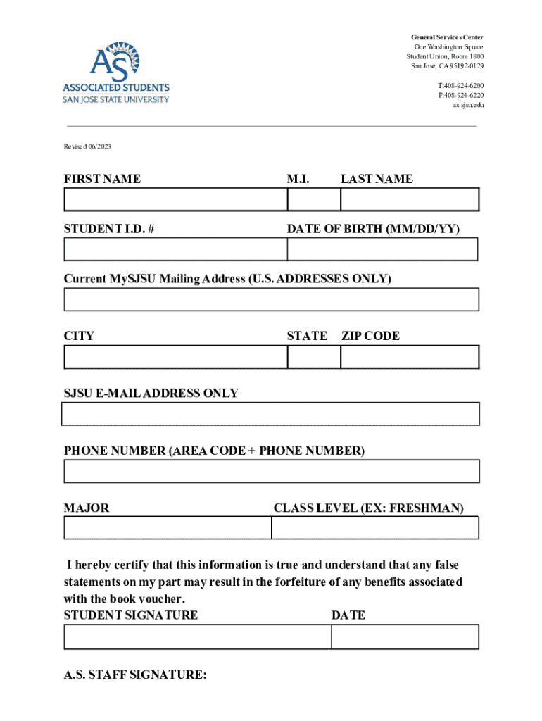 The A.S. Affordable Textbook Program Application is a scholarship application form used by students at San José State University to apply for a $200 voucher to purchase textbooks and school supplies.