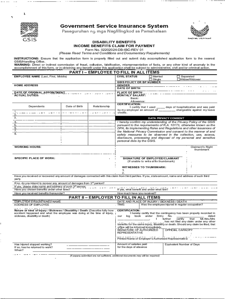 The GSIS Disability Benefits Income Claim Form is a crucial document for employees in the Philippines seeking disability benefits through the Government Service Insurance System (GSIS). This form serves to streamline the claims process, providing essential information that facilitates access to financial support during challenging times. By accurately filling out the form, employees can effectively communicate their circumstances and ensure they receive the assistance they need.