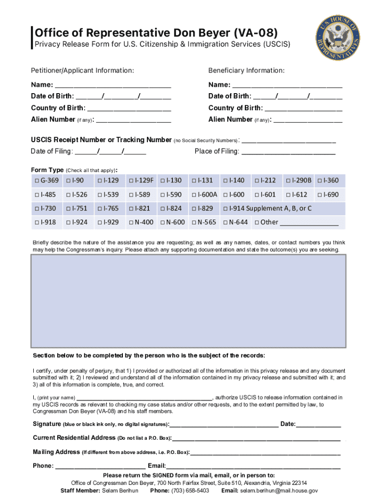 The USCIS Privacy Release Form serves a crucial function within immigration procedures, allowing petitioners and applicants to authorize the U.S. Citizenship and Immigration Services (USCIS) to release their personal information. This form is primarily used by individuals who are navigating the complexities of their immigration cases. Specifically, this form is significant for those authorizing information release to a congressional office, such as that of Congressman Don Beyer, which can facilitate assistance with their immigration matters.