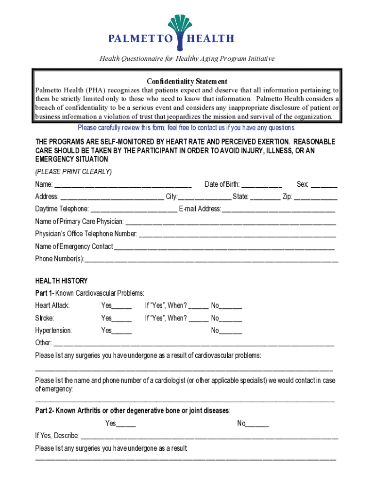 Get Started Today! Fill Out Your Health Questionnaire for Healthy Aging Program