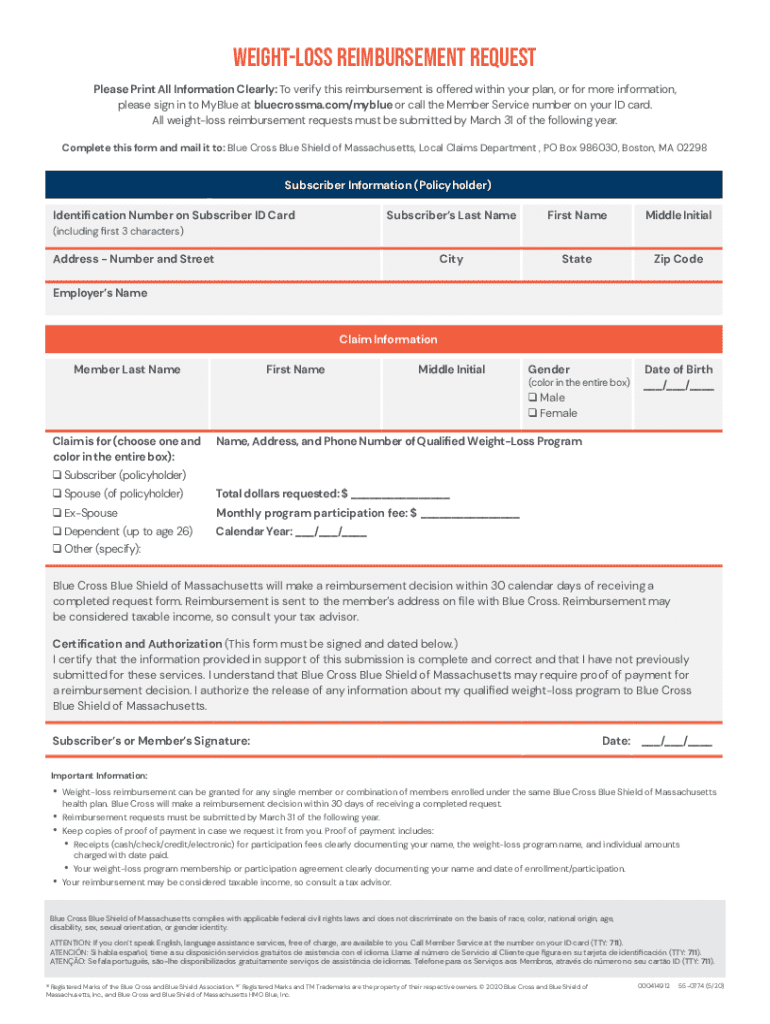 Members and subscribers of Blue Cross Blue Shield in Massachusetts are eligible to use this form to claim reimbursement for qualified weight-loss programs.