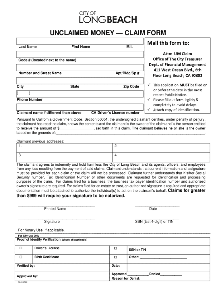 The California Unclaimed Money Claim Form serves as a vital tool for individuals seeking to reclaim unclaimed funds held by the City of Long Beach. This form facilitates the process of accessing money that rightfully belongs to individuals, emphasizing the importance of claiming these funds. Claimants must certify their information under penalty of perjury, ensuring the integrity of the claims submitted.