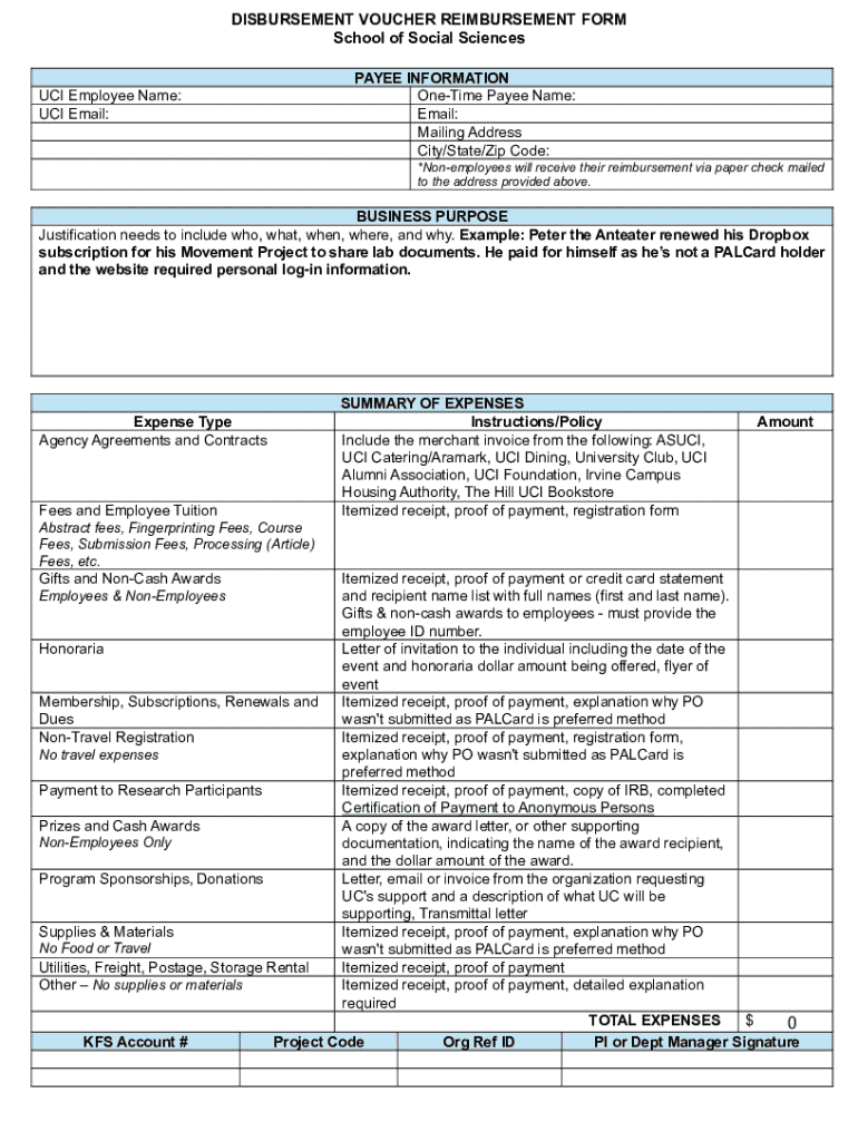 Both UCI employees and non-employees are eligible to use the Disbursement Voucher Reimbursement Form to request reimbursement for legitimate business-related expenses.