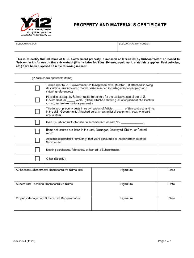 The Property and Materials Certificate is a business form used by subcontractors to certify the disposition of U.S. Government property purchased, fabricated, or loaned for use on a subcontract.