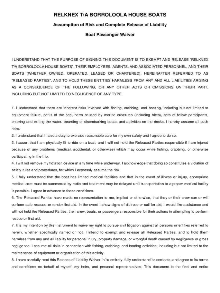 The Boat Passenger Waiver is a legal document used by RELKNEX T/A BORROLOOLA HOUSE BOATS to exempt and release themselves from liability for injuries or damages during boating activities.