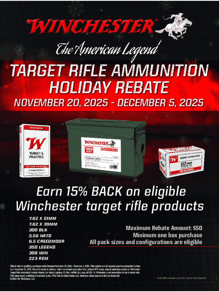 To be eligible for the Winchester Target Rifle Ammunition Holiday Rebate, customers must purchase qualified Winchester target rifle ammunition between November 20, 2025, and December 5, 2025. Additionally, you must be a US citizen or legal resident.