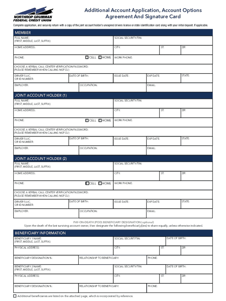 The Additional Account Application Agreement serves as a formal mechanism for members of Northrop Grumman Federal Credit Union to apply for additional accounts. It necessitates the inclusion of crucial personal information, details about any joint account holders, and beneficiary designations. This agreement simplifies the application process and ensures that all necessary data is collected efficiently.