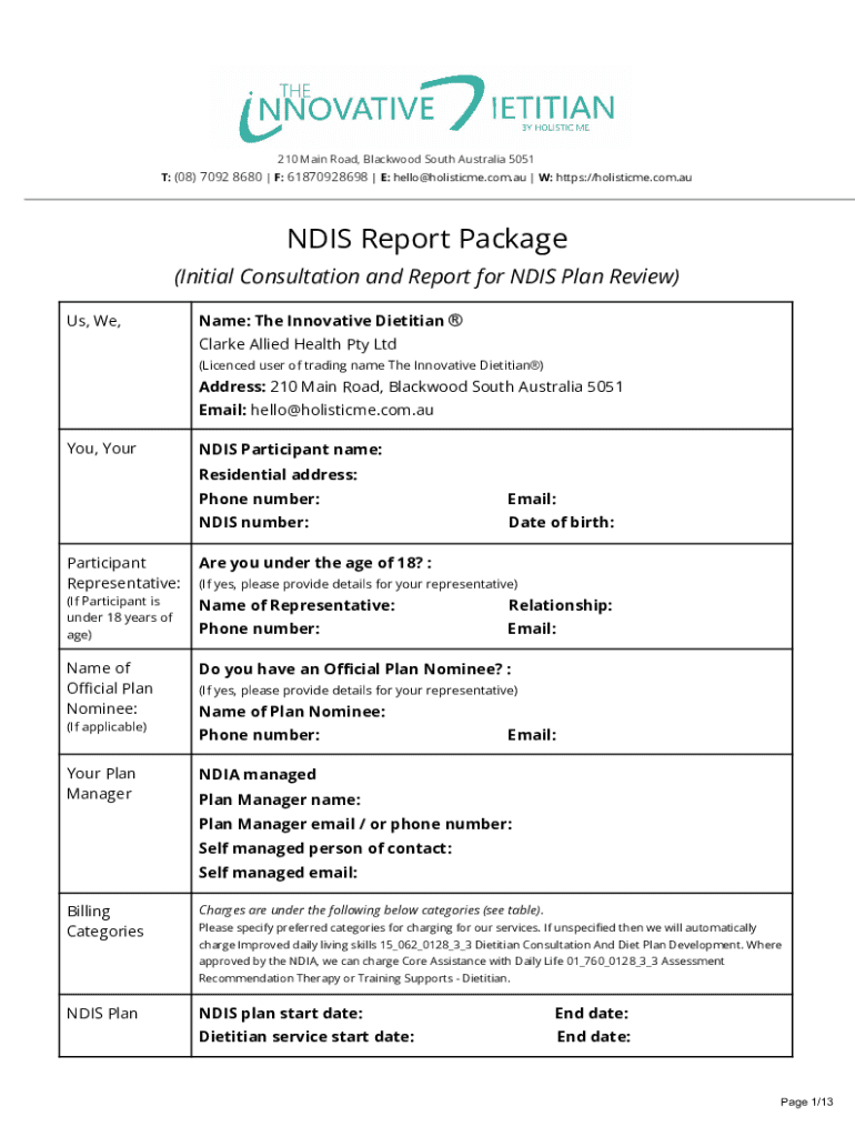 The NDIS Report Package is a crucial tool used by NDIS participants to facilitate plan reviews. This form plays a significant role in providing comprehensive documentation required during the consultation and funding advocacy processes. It is specifically designed to collect vital information pertaining to the participant's dietary needs, medical history, and living situation.