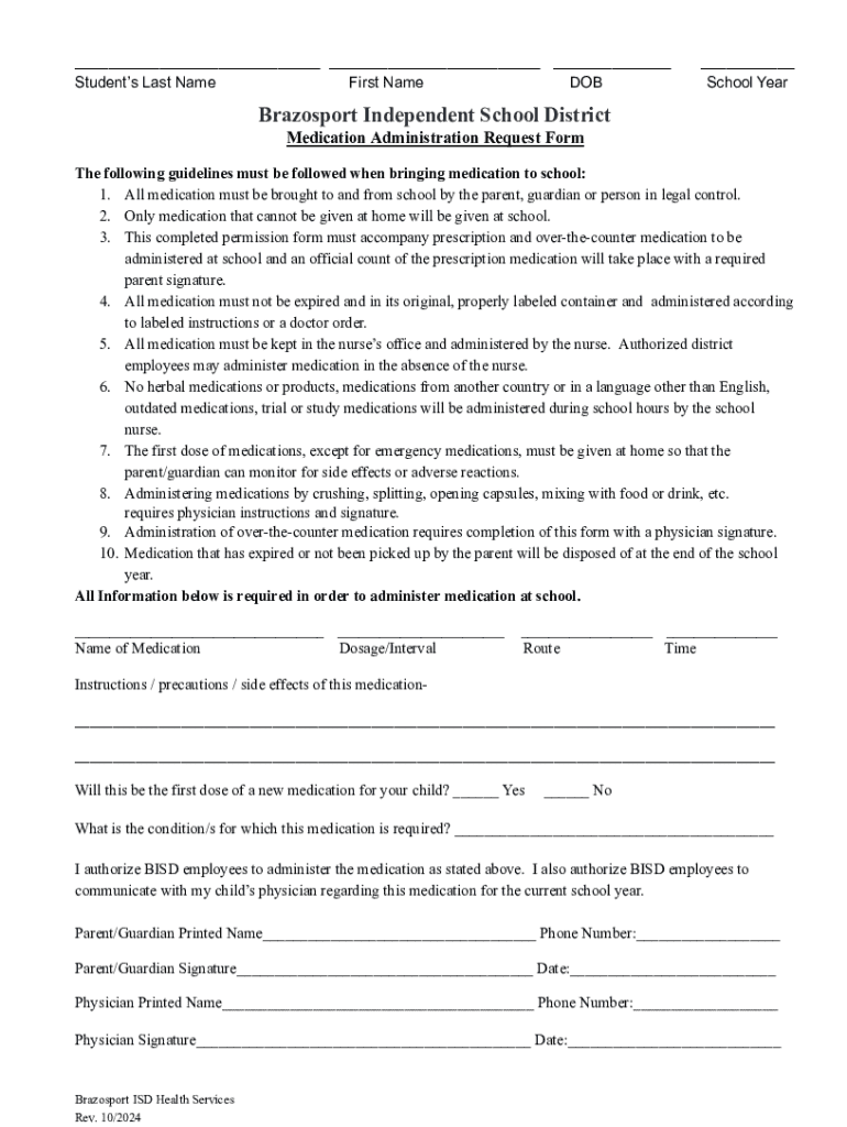 The form is intended for students attending Brazosport Independent School District who require medication during school hours. Eligibility is determined by the need for prescribed medication and the completion of all required signatures.