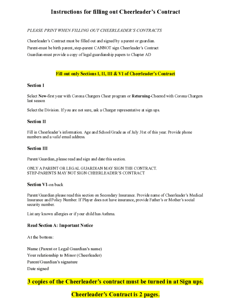 The Cheerleader’s Contract must be completed by a parent or legal guardian of the cheerleader. This ensures that the necessary consent for participation is legally granted.