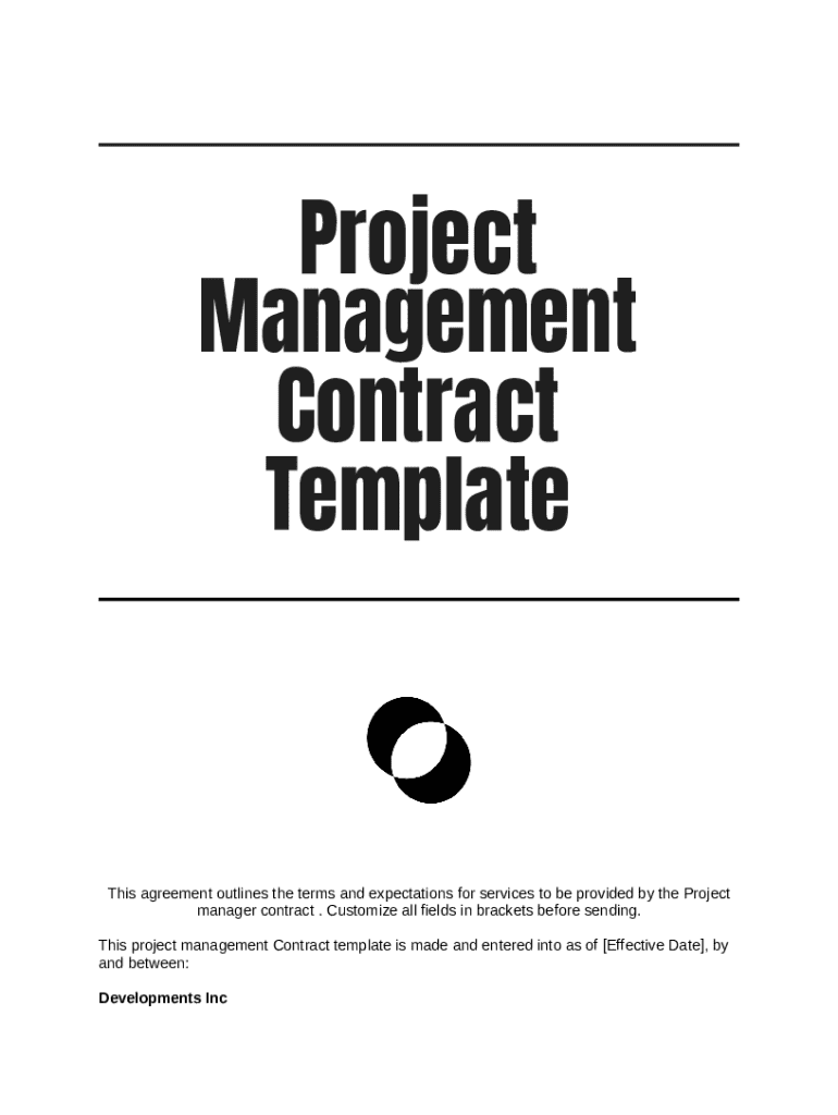 The Project Management Contract Template is a service agreement used by project managers and clients to outline the terms for project management services.