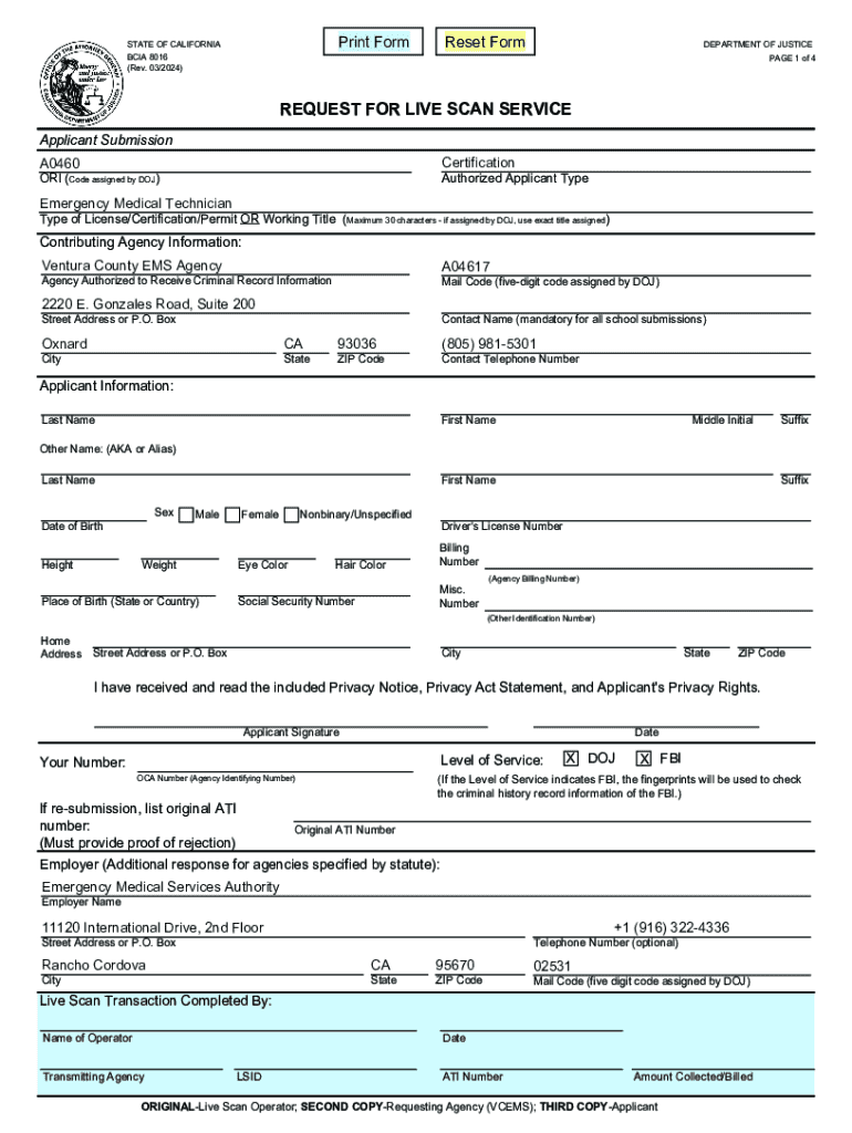Submitting the California EMT Live Scan Request Form brings multiple advantages for applicants. Firstly, it enables individuals to meet the eligibility requirements for certification, complying with state regulations and standards. Secondly, obtaining clearances from the DOJ and FBI is integral to the overall certification process for EMTs, enhancing public trust in the emergency medical services.