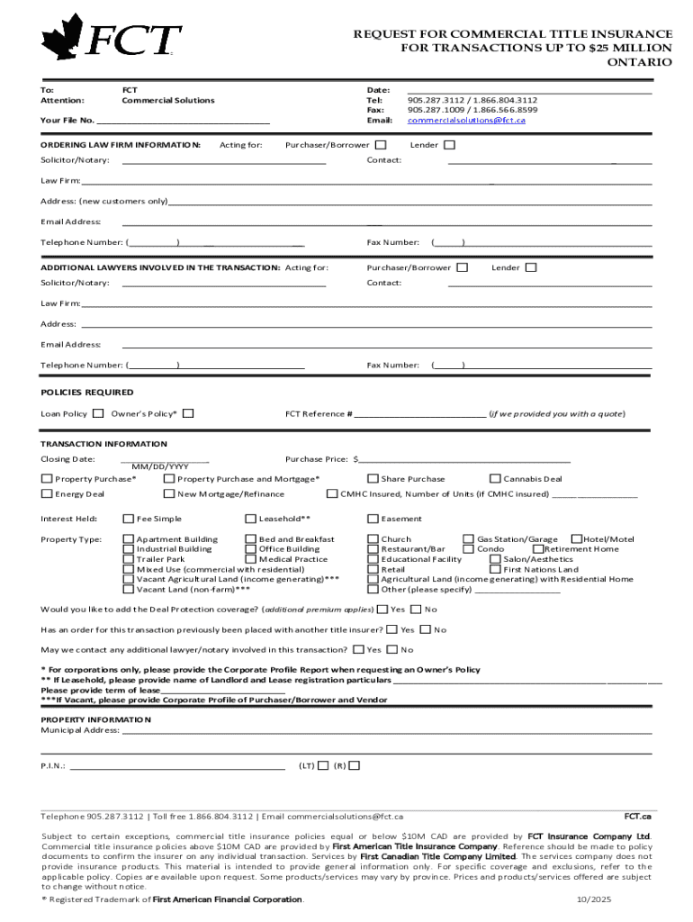 The Request for Commercial Title Insurance is a legal document used by law firms and purchasers/mortgagors to request title insurance policies for commercial properties in Ontario, Canada.