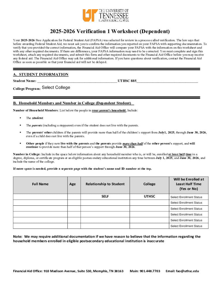 Dependent students applying for federal financial aid and their parents are eligible to complete the 2025-2026 Verification Worksheet. Both parties must provide accurate information to verify details submitted in their FAFSA.
