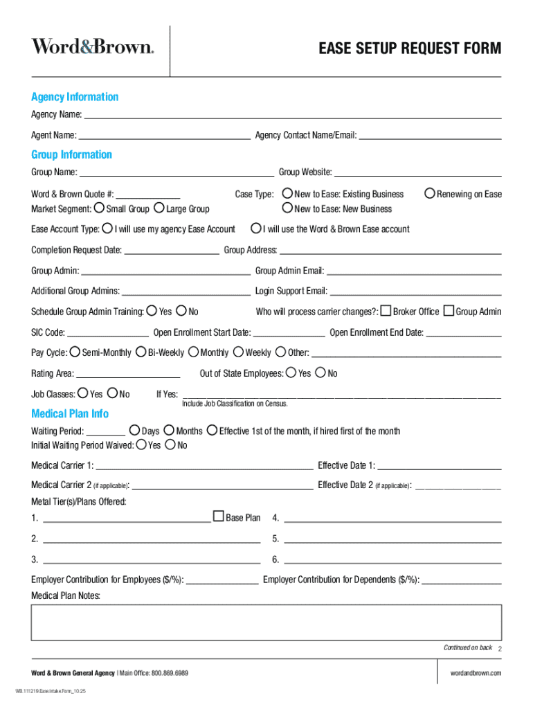 The Ease Setup Request Form is a service agreement used by agencies and brokers to initiate the setup process for new or renewing groups in the Ease platform.