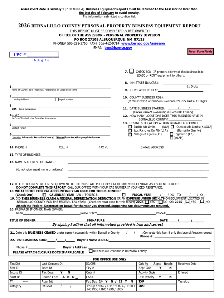 All business owners in Bernalillo County who own personal property (equipment) and are subject to local business taxes must complete this form annually by February 28th.
