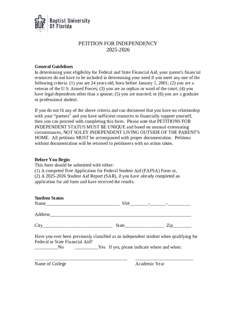 The Petition for Independent Status is a student aid form used by students to apply for federal and state financial aid without considering their parents' financial resources.