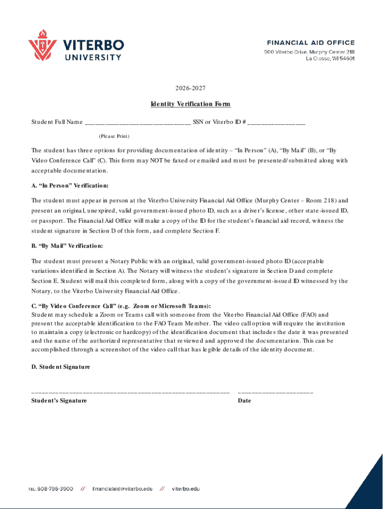 The Viterbo University Identity Verification Form is a crucial document that enables students to verify their identity for financial aid purposes. Its primary function is to ensure the integrity of identity claims made by students applying for assistance. By completing this student identity verification form, students can confirm their identity, which is vital for receiving financial aid benefits.