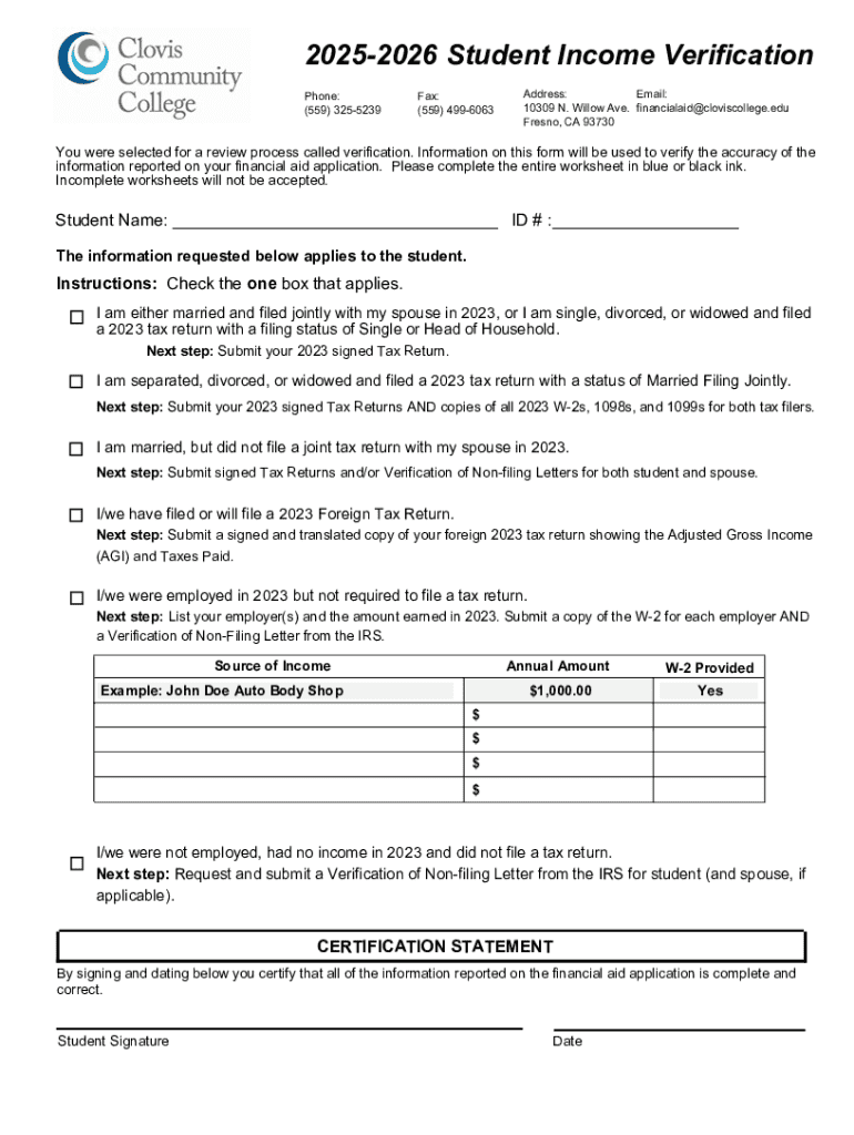 Students at Clovis College who are pursuing financial aid and have specific financial conditions must submit the 2 Student Income Verification Form. This requirement often applies to students experiencing changes in income or those falling under certain demographic and financial thresholds. Understanding whether you meet these criteria is essential for navigating the financial aid process.