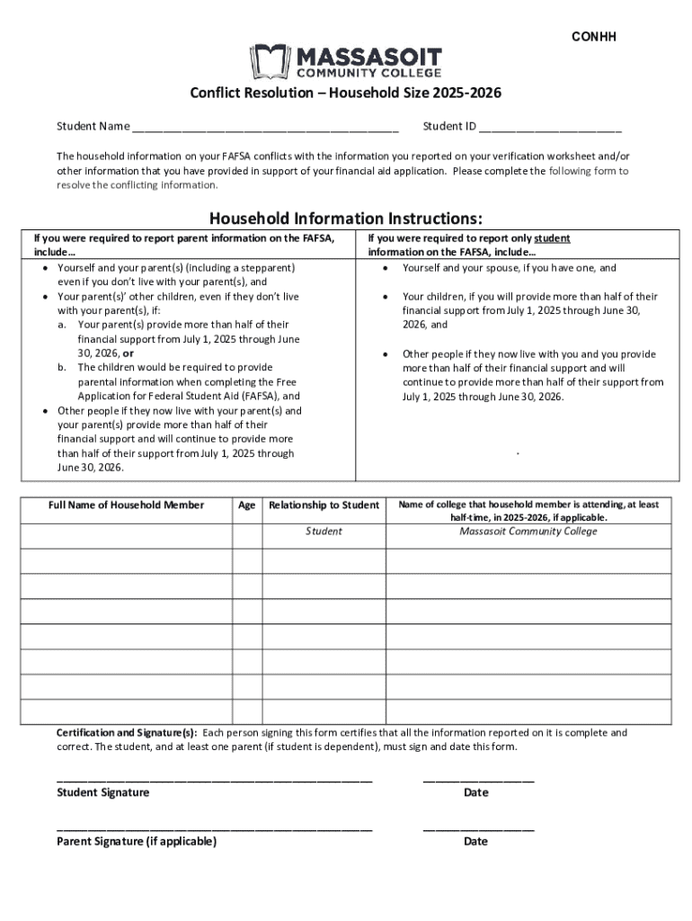 The Conflict Resolution – Household Size 2025-2026 is a financial aid form used by students and parents to resolve discrepancies in household information reported on the FAFSA.