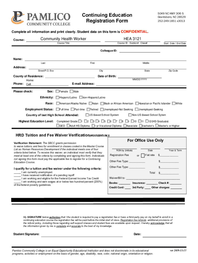 When filling out the Pamlico Community College Registration Form, you will need personal identification information such as your name, address, date of birth, and possibly employment documentation, especially if applying for a tuition fee waiver.