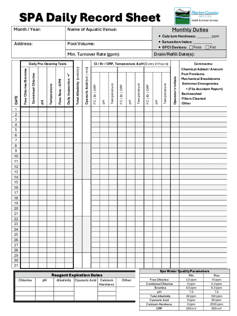 This sheet is essential for businesses operating spas or pools regularly, as it underlines their commitment to safety and quality management.