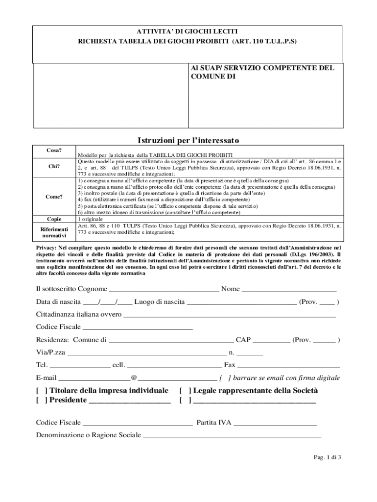 Il modulo 'Richiesta di Proibizione del Gioco Italiano' è un tipo di documento utilizzato da individui ed enti per richiedere la 'Tabella dei Giochi Proibiti' in base all'Articolo 110 del TULPS.