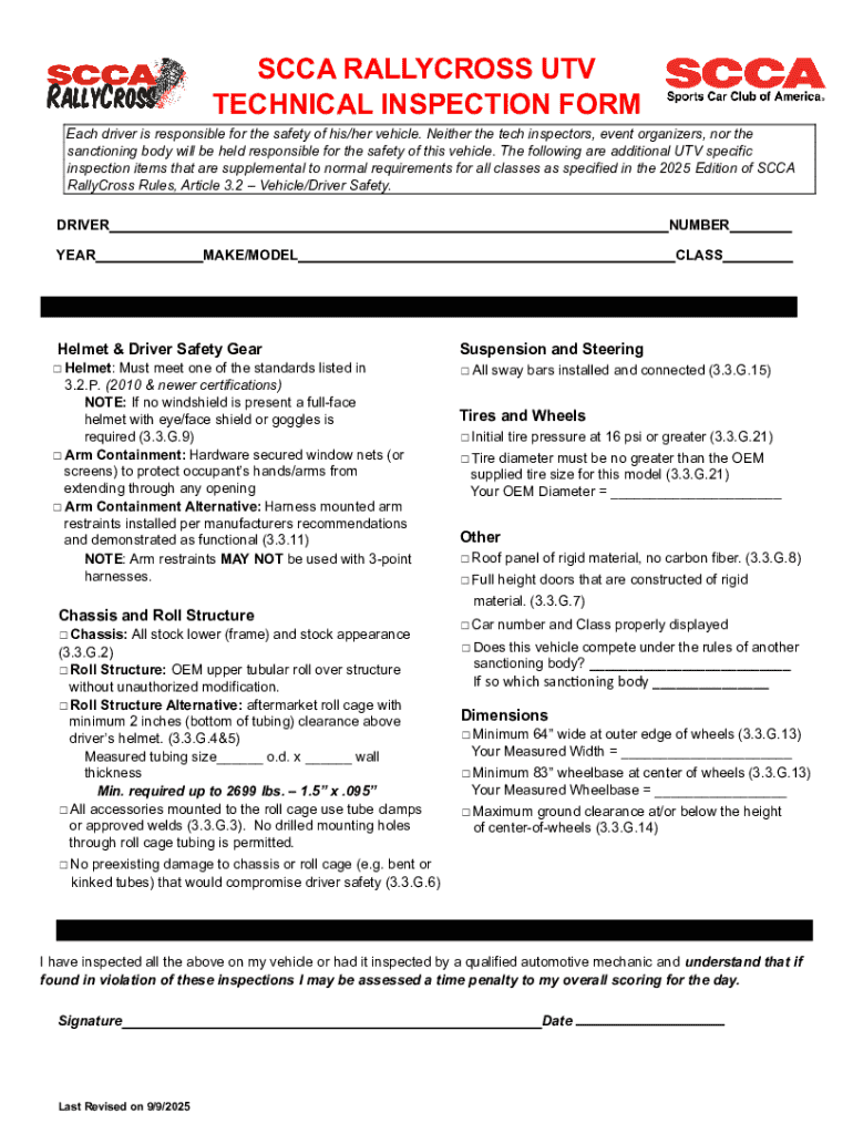 The SCCA RallyCross UTV Technical Inspection Form is a compliance document used by drivers to ensure their UTVs meet safety standards for rallycross events.