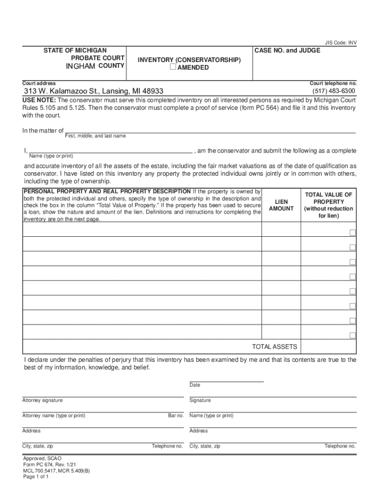 The Michigan Probate Court Inventory Form (Form PC 674) is a legal document used by conservators in Michigan to list and value all assets of an estate under conservatorship.