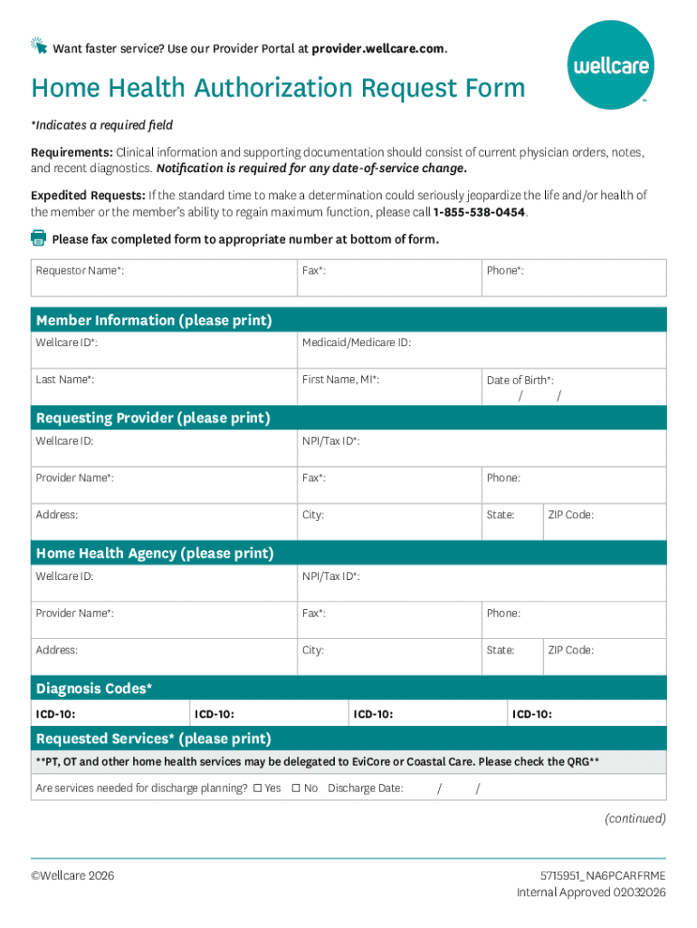 To submit the Home Health Authorization Request Form, the patient must be eligible for home health services under Medicare or Medicaid. Physicians must verify patient eligibility, including diagnosis and service needs, prior to submission.