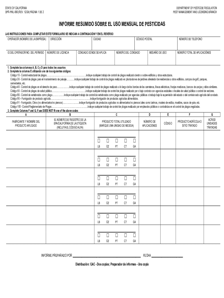 El California Monthly Pesticide Use Report es un formulario utilizado por empresas de control de plagas y agencias públicas para reportar aplicaciones de pesticidas en California.