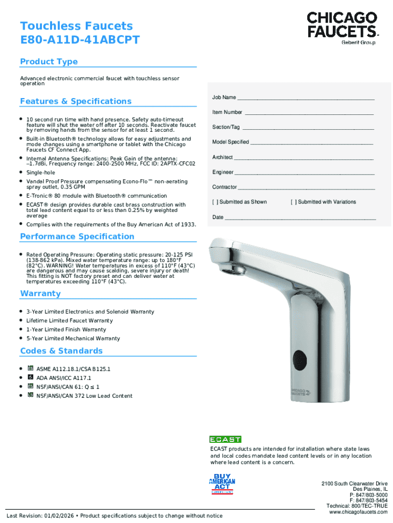 The Chicago Faucets E-Tronic 80 Specification Form is a business form used by architects and contractors to specify details of the E-Tronic 80 advanced electronic commercial faucet.