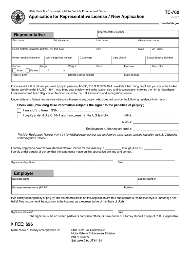 The Utah Representative License Application is a crucial government form for individuals and business owners in Utah seeking to apply for or renew their representative license. This application collects essential personal information and highlights the associated $26 fee required by the Utah State Tax Commission. The form typically requests details such as your full name, address, social security number, and citizenship status, making it a comprehensive tool for applicants.
