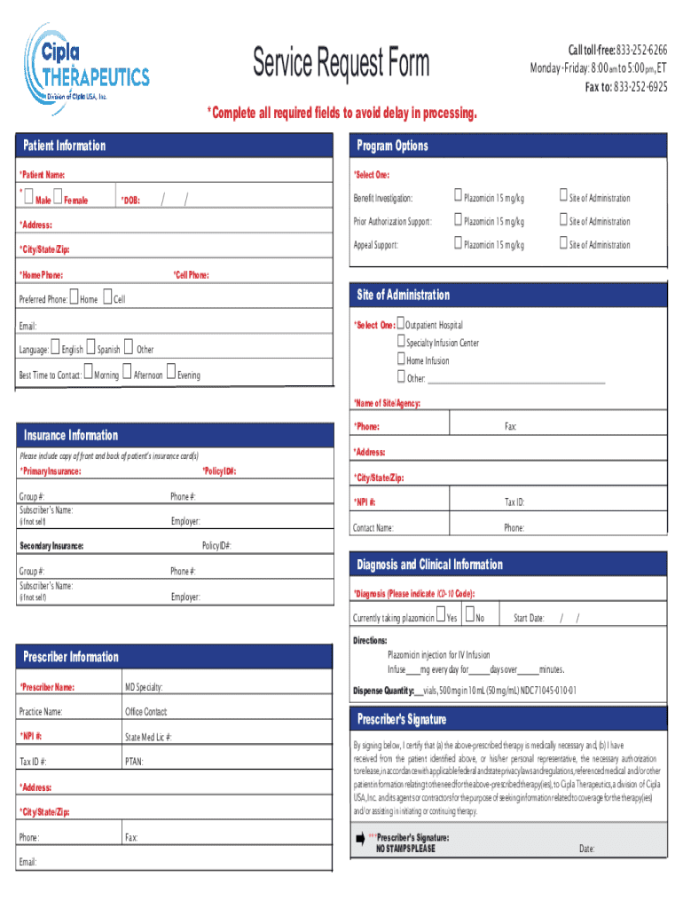 The Patient Authorization Form for Plazomicin Therapy serves to authorize healthcare providers to share essential health information related to Plazomicin therapy with Cipla Therapeutics. This form must be completed with accuracy to ensure the correct transmission of patient data. Prescriber and patient signatures are critical, signifying consent to share information for therapeutic purposes.