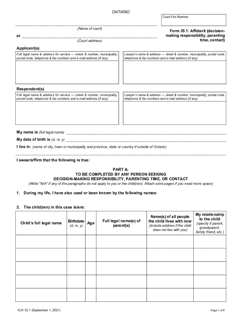 The Ontario Affidavit Form 35.1 is a legal document used by applicants in family court to provide essential information regarding decision-making responsibility, parenting time, and contact related to children.