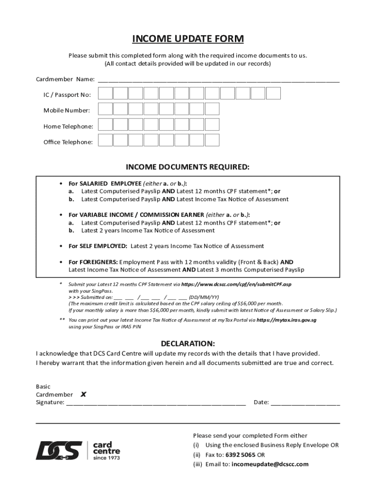 The Income Update Form is a personal financial statement used by cardmembers to submit their income documents to DCS Card Centre for record updates.