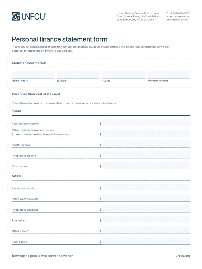 The Personal Finance Statement Form is a crucial document used by the United Nations Federal Credit Union (UNFCU) to assess the financial situations of its members. This form collects detailed information regarding a member's financial status, which is essential for evaluations related to loans and other financial products.