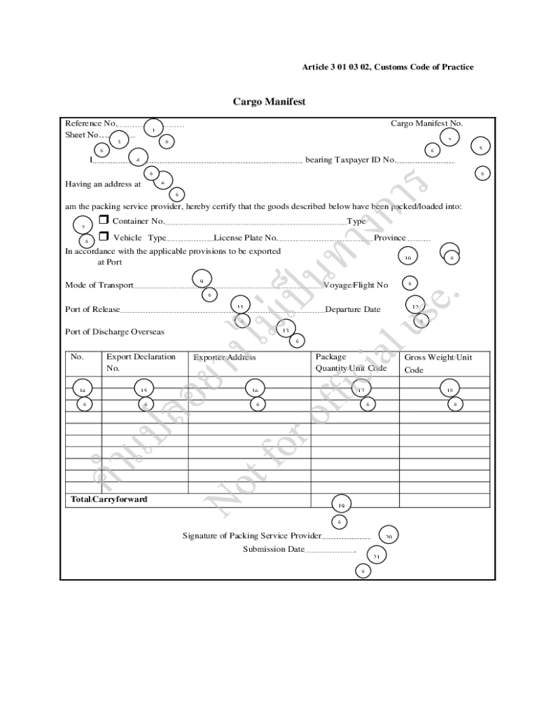 The Cargo Manifest Form is a government document used by exporters in Thailand to certify the packing and loading of goods for export.