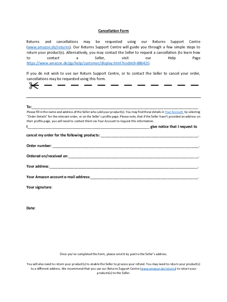 The Amazon Cancellation Form is a crucial document used by customers to formally request the cancellation of orders on Amazon.de. This form serves various functions, primarily allowing users to initiate cancellations related to purchases they wish to retract. Common scenarios for using the form include changing one’s mind about a purchase, encountering issues with payment, or needing to return an unwanted gift.