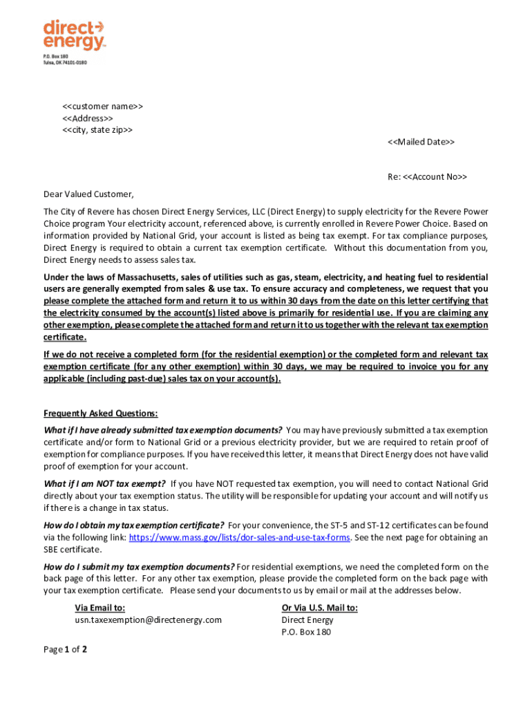 The Massachusetts Sales Tax Exemption Form is essential for residents participating in the Revere Power Choice program. This document certifies a customer's exemption status regarding sales tax on electricity consumption, allowing qualified individuals and businesses to benefit from significant savings.