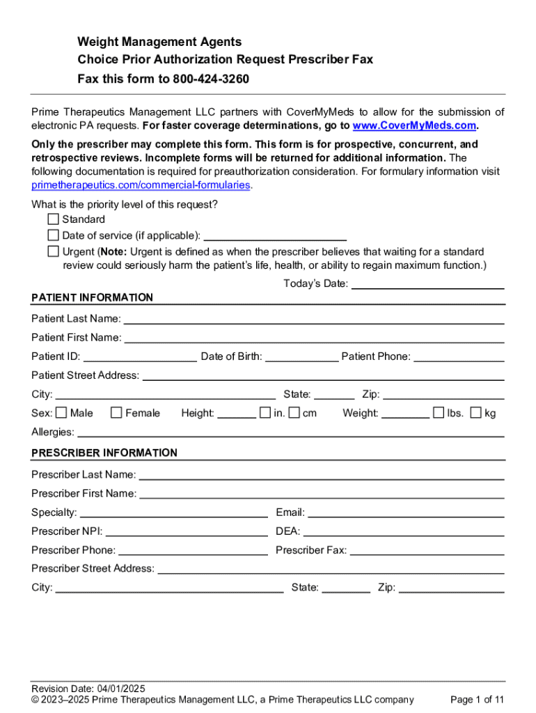 The weight management agents prior is a specific form designed to collect essential information from individuals seeking assistance in managing their weight with prescribed agents. This form serves as a preliminary step in ensuring effective treatment and monitoring of weight management strategies.
