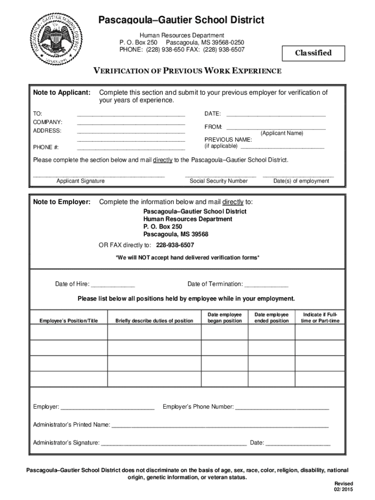 The Verification of Previous Work form is a document used by employers to confirm an applicant's work experience and employment history.