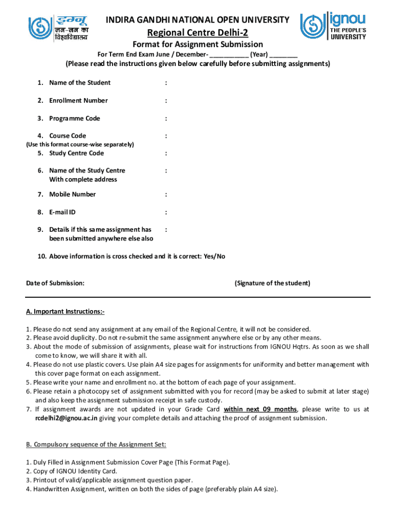 Students often encounter several common errors when completing the IGNOU Assignment Submission Form. These mistakes can include missing information or incorrectly filled fields. To avoid such issues, it is essential to perform thorough checks before final submission. Following best practices, such as double-checking each section for accuracy and ensuring all necessary documents are attached, can greatly enhance the likelihood of a successful submission.
