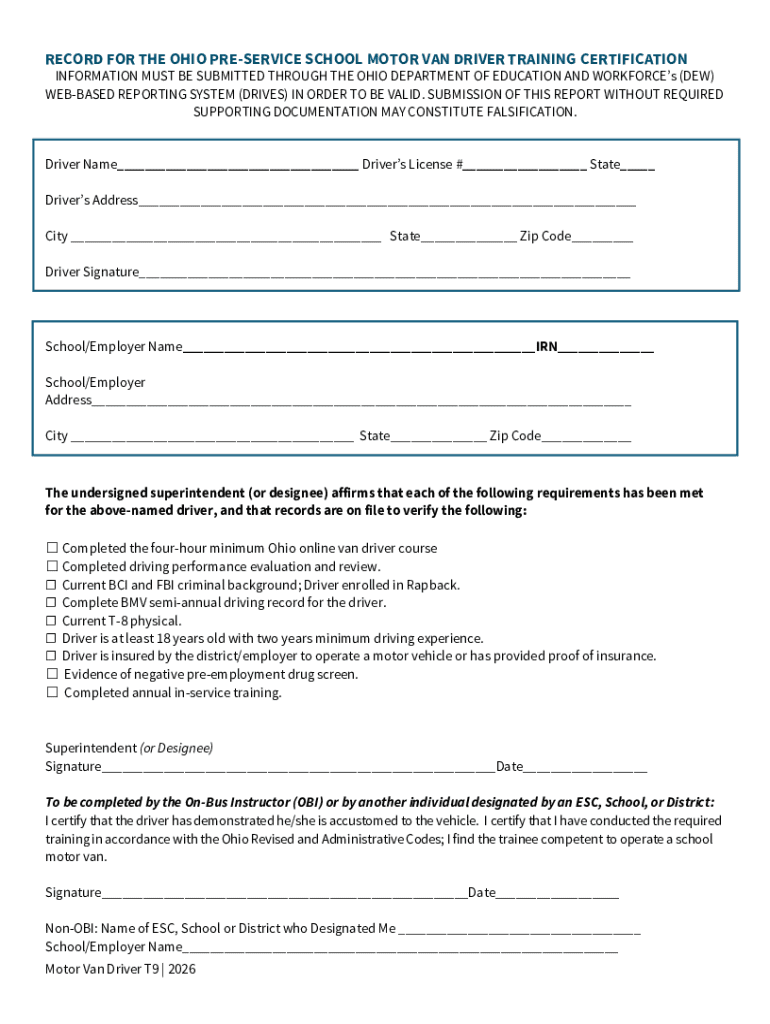 Get the free Ohio Pre-Service School Motor Van Driver Training Certification