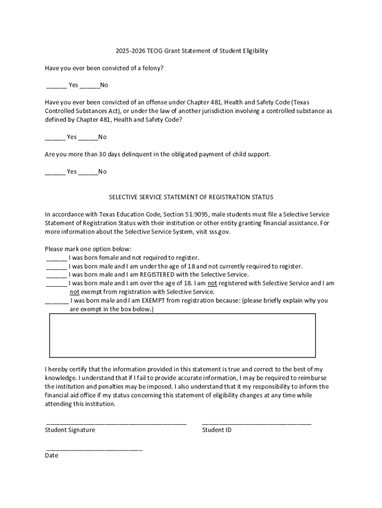 To qualify for the TEOG grant, applicants must meet specific eligibility requirements, which include factors such as residency and demonstrated financial need. Key criteria include: